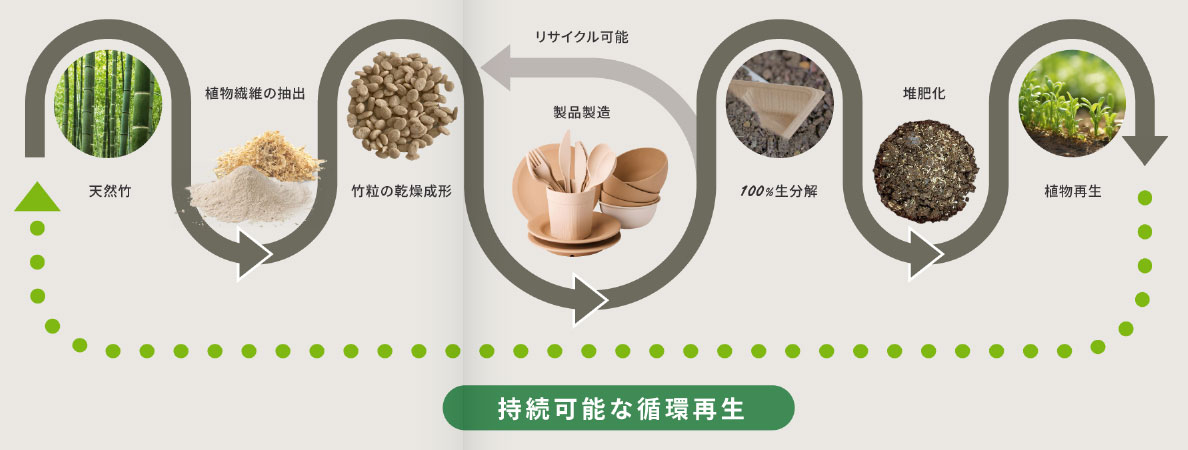 リサイクル技術を活用した素材との配合や、代替材料の共同開発、さらには竹由来の生分解製品の提供を行っています。