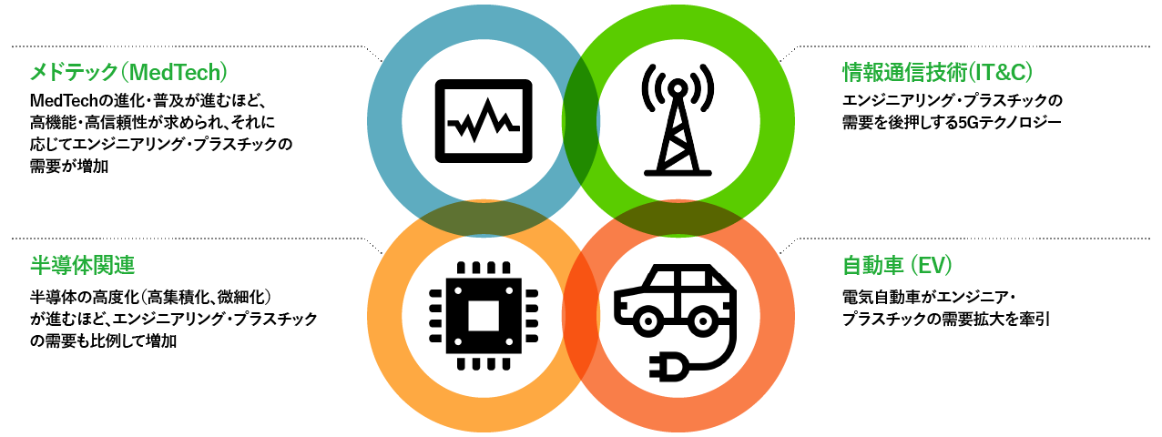 中長期的に注力すべき成長分野として、従来から取り組んできた ①5Gに代表される情報通信技術分野、②EVに代表されるモビリティー用途に加え、③半導体関連分野、④メドテック(MedTech)分野を新たな重点領域と位置付け戦略的に取り組んでいます。
